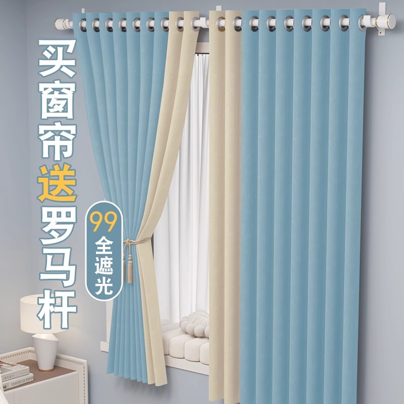 卧室飘窗小窗户窗帘罗马杆一整套免打孔安装现在简约轻奢遮光窗帘