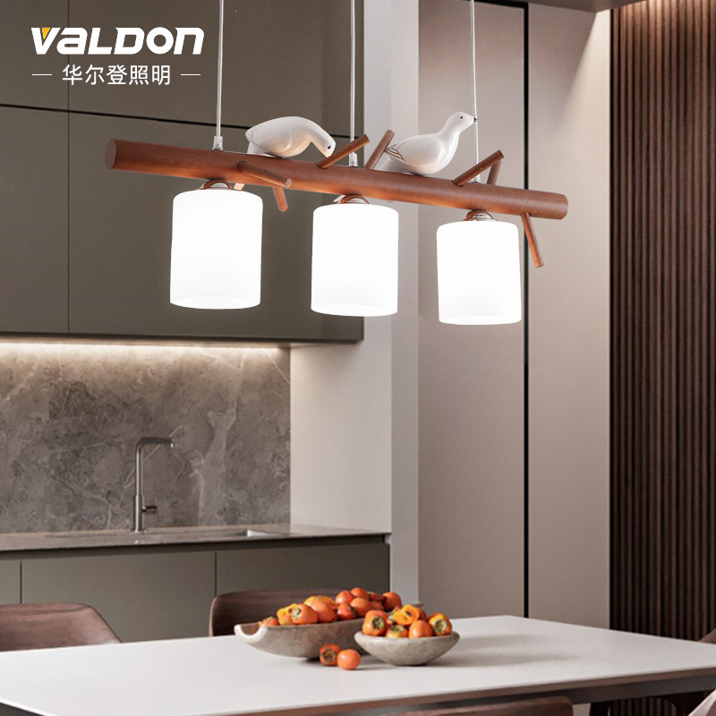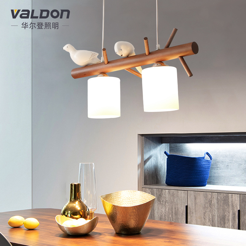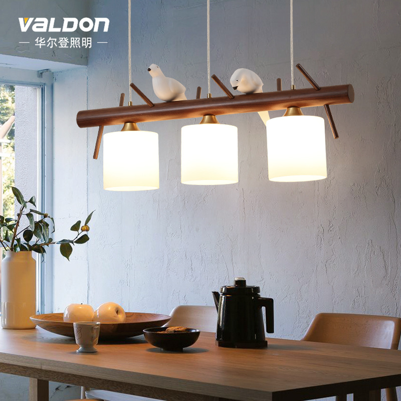 个性网红餐厅灯胡桃木色三头小鸟创意led简约饭厅吊灯实木吧台灯