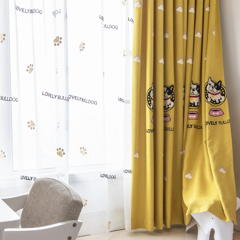 清仓北欧黄色卡通幼儿园棉麻绣花遮光布料窗帘成品儿童房卧室窗纱