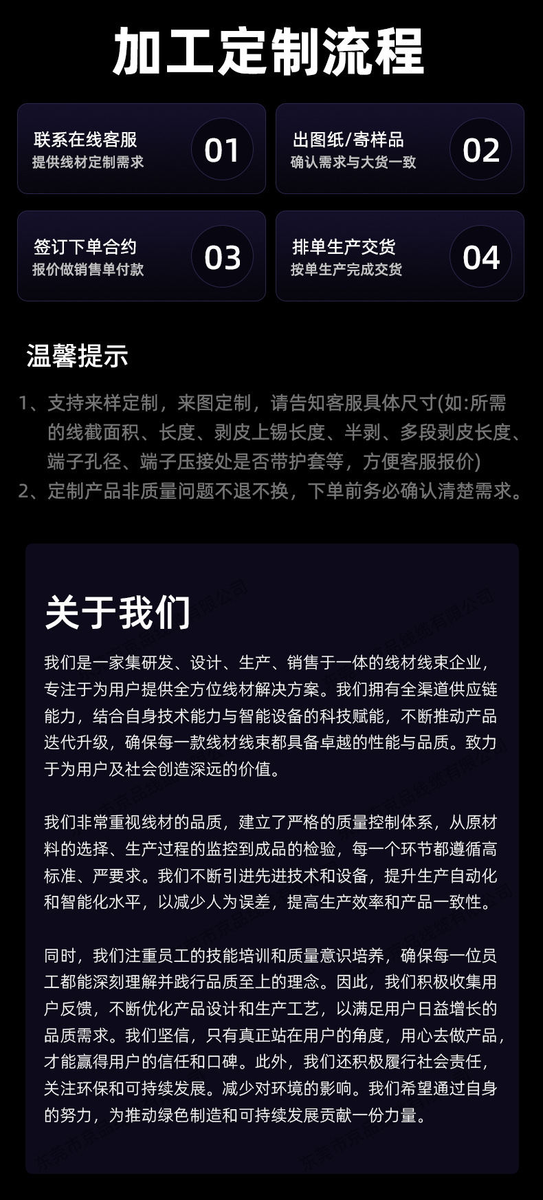 主营产品或服务: UL电子线; 硅胶线; 铁氟龙线; 彩排线; 护套线; 电源线; 低烟无卤电线; 汽车线束; 1007; 1015; 2468; 2464; 1332; 10064; 2725; 2547; 1569; RV; RVB; RVV;