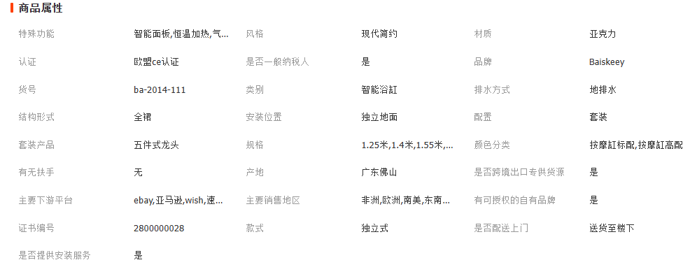 主营产品或服务: 智能马桶; 淋浴房; 浴缸; 蒸汽房; 户外浴缸; 淋浴花洒; 陶瓷面盆; 普通坐便器; 五金配件; 洗手盆柜