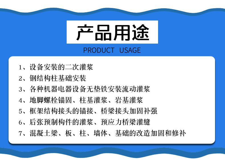 2、自流态:现场只需加水搅拌后,直接灌入设备基础,不需震捣便可填充设备基础的全部空隙。
