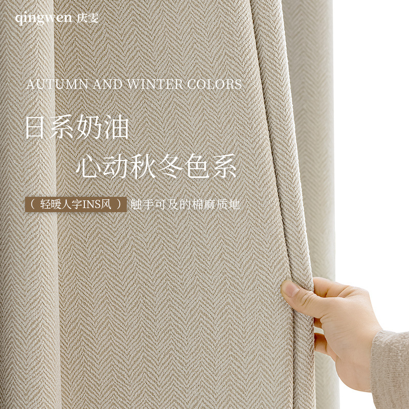 赠送高温定型雪尼尔人字纹成品窗帘日式奶茶色遮光窗帘布家 装客厅