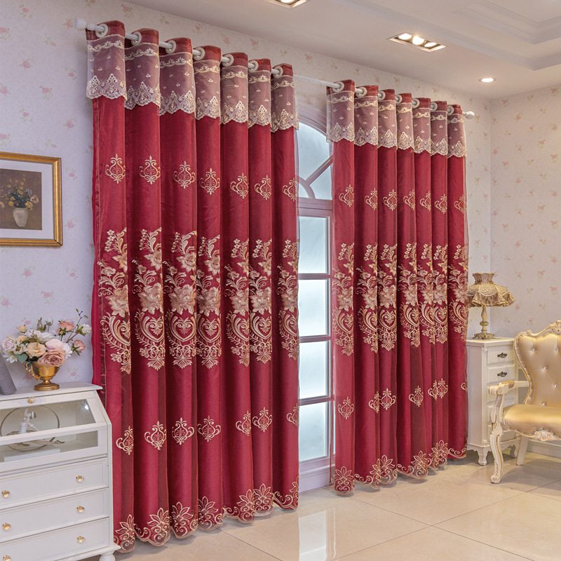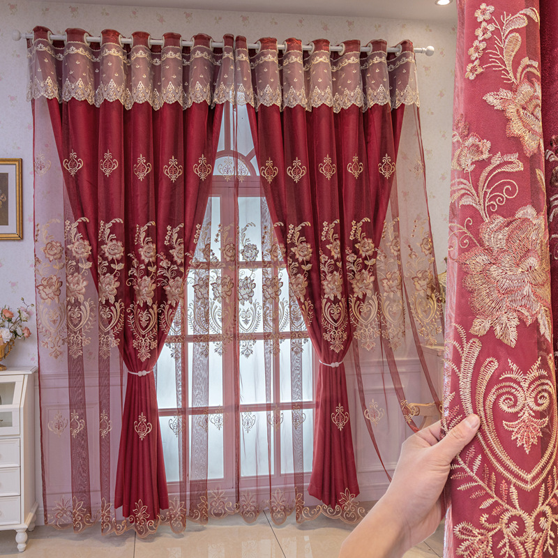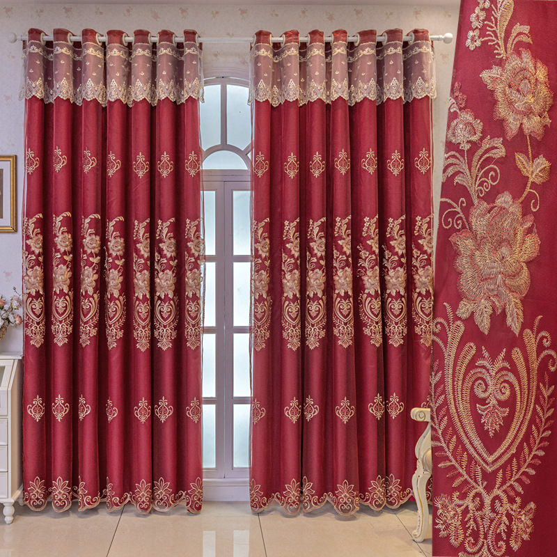 高档喜庆红色绣花窗纱窗帘双层一体遮光布料成品卧室客厅阳台落地