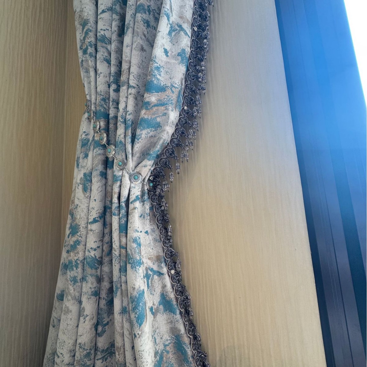 新款冰川蓝雪尼尔窗帘新中式提花高档客厅窗帘卧室遮光大理石窗帘