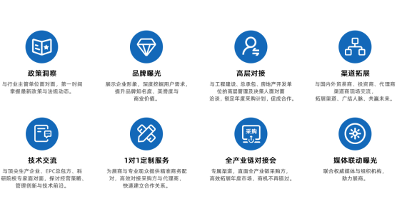 央企及地方总包商参与度高,供采双方对接、采购观展团,特邀EPC工程总承包单位洽谈区内对接。组织以集团为单位的采购观展团。提前登记采购单位拟在建工程项目、工程采购计划需求;提前提供展商展品宣传;现场VIP采购单位宣传册,通过采购方调研反馈,为展商提供更高附加值的专属服务;提前调研采购单位考察供应商意愿,展后按计划有序安排,为展商提供增值服务。