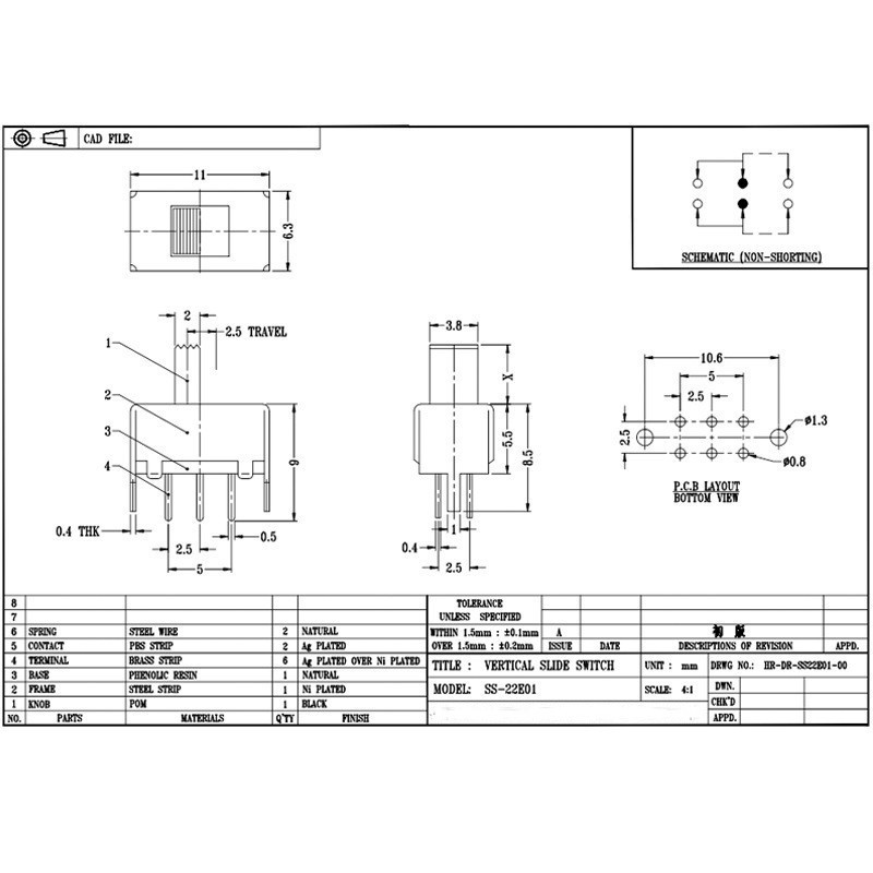 东莞立式拨动开关SS22E01双排六脚2档位电源滑动开关2P2T推动开关