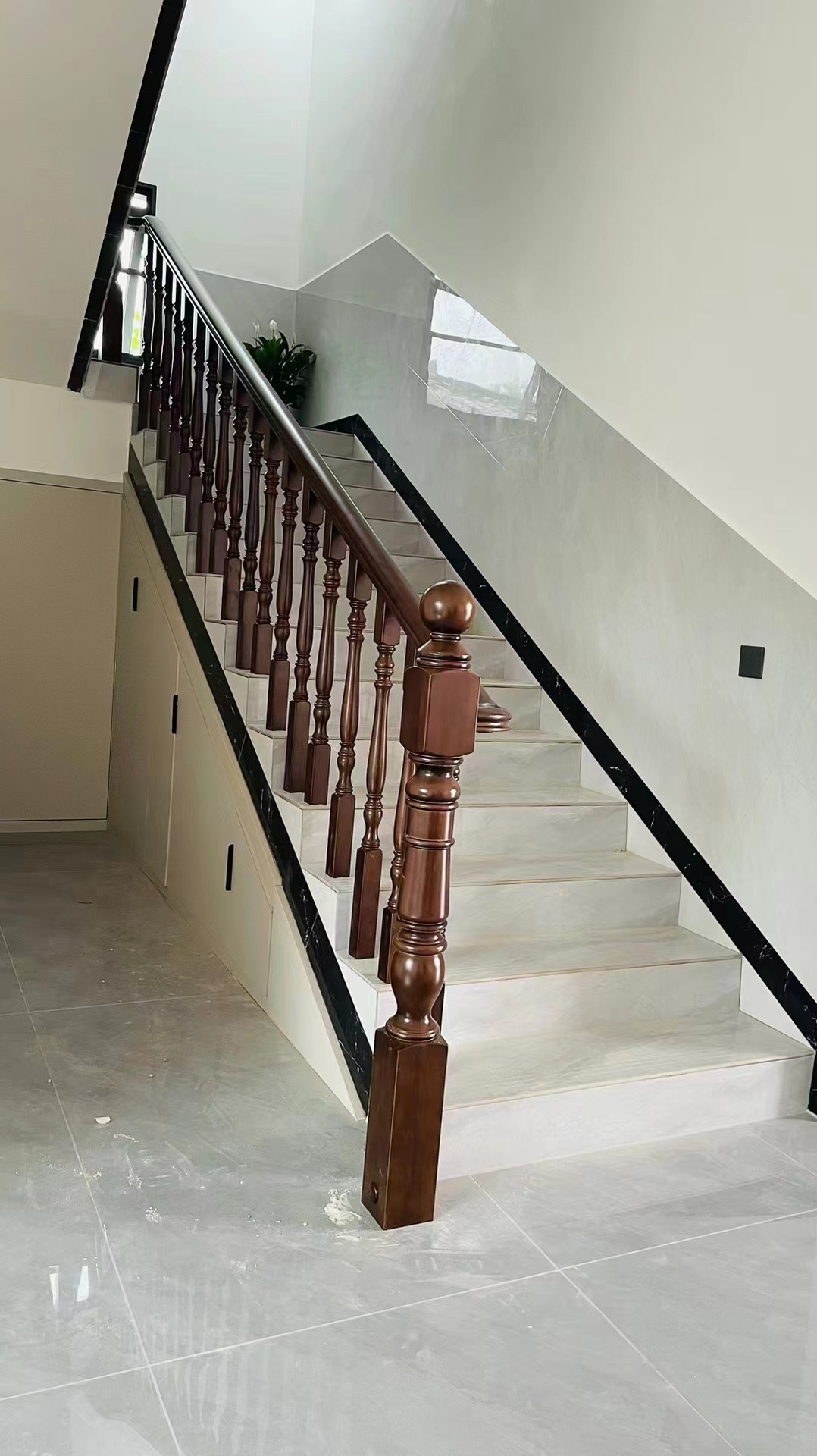 定制别墅楼梯橡胶木实木扶手栏杆现代轻奢极简实木栏杆及实木整梯