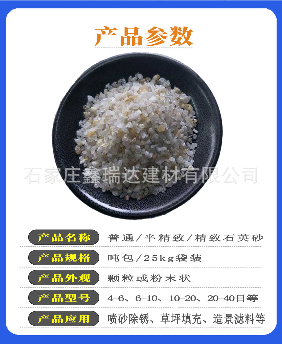 本网页所展示的有关【石英砂 滤料硅砂 精制石英砂 酸洗石英砂 草坪填充用石英砂石英粉_瓦工系统_石家庄鑫瑞达建材有限公司】的信息/图片/参数等由工装云的会员【石家庄鑫瑞达建材有限公司】提供,由工装云会员【石家庄鑫瑞达建材有限公司】自行对信息/图片/参数等的真实性、准确性和合法性负责,本平台(本网站)仅提供展示服务,请谨慎交易,因交易而产生的法律关系及法律纠纷由您自行协商解决,本平台(本网站)对此不承担任何责任。您在本网页可以浏览【石英砂 滤料硅砂 精制石英砂 酸洗石英砂 草坪填充用石英砂石英粉_瓦工系统_石家庄鑫瑞达建材有限公司】有关的信息/图片/价格等及提供【石英砂 滤料硅砂 精制石英砂 酸洗石英砂 草坪填充用石英砂石英粉_瓦工系统_石家庄鑫瑞达建材有限公司】的商家公司简介、联系方式等信息。