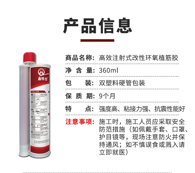本网页所展示的有关【环氧注射式植筋双面胶建筑工程钢筋混凝土锚固剂高强定制植筋胶_五金工具_武汉明合瑞海实业有限公司】的信息/图片/参数等由工装云的会员【武汉明合瑞海实业有限公司】提供,由工装云会员【武汉明合瑞海实业有限公司】自行对信息/图片/参数等的真实性、准确性和合法性负责,本平台(本网站)仅提供展示服务,请谨慎交易,因交易而产生的法律关系及法律纠纷由您自行协商解决,本平台(本网站)对此不承担任何责任。您在本网页可以浏览【环氧注射式植筋双面胶建筑工程钢筋混凝土锚固剂高强定制植筋胶_五金工具_武汉明合瑞海实业有限公司】有关的信息/图片/价格等及提供【环氧注射式植筋双面胶建筑工程钢筋混凝土锚固剂高强定制植筋胶_五金工具_武汉明合瑞海实业有限公司】的商家公司简介、联系方式等信息。