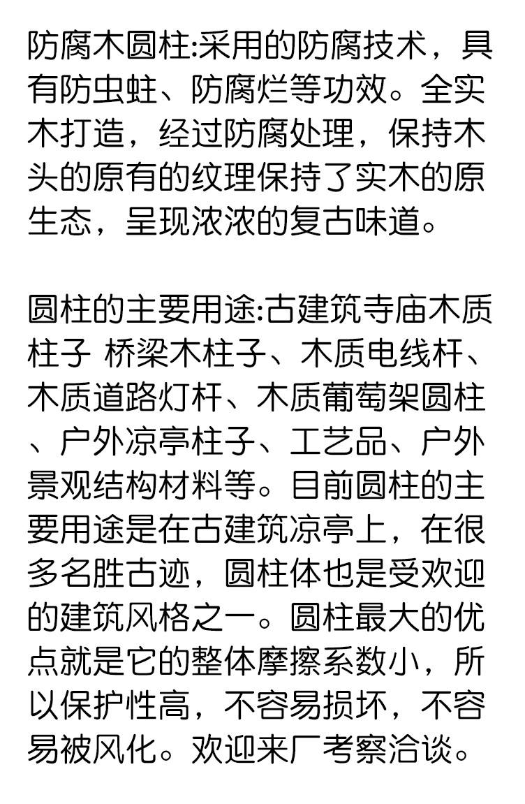 本网页所展示的有关【临沂防腐木条厂家樟子松圆木芬兰木花旗松材质圆柱木房梁原木立柱_木板_临沂融亿国际贸易有限公司】的信息/图片/参数等由工装云的会员【临沂融亿国际贸易有限公司】提供,由工装云会员【临沂融亿国际贸易有限公司】自行对信息/图片/参数等的真实性、准确性和合法性负责,本平台(本网站)仅提供展示服务,请谨慎交易,因交易而产生的法律关系及法律纠纷由您自行协商解决,本平台(本网站)对此不承担任何责任。您在本网页可以浏览【临沂防腐木条厂家樟子松圆木芬兰木花旗松材质圆柱木房梁原木立柱_木板_临沂融亿国际贸易有限公司】有关的信息/图片/价格等及提供【临沂防腐木条厂家樟子松圆木芬兰木花旗松材质圆柱木房梁原木立柱_木板_临沂融亿国际贸易有限公司】的商家公司简介、联系方式等信息。