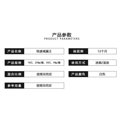 本网页所展示的有关【厂家直销快速堵漏王20公斤带水堵漏卫生间水不漏外墙管道快干水泥_水泥、砂浆_广州黑豹防水建材有限公司】的信息/图片/参数等由工装云的会员【广州黑豹防水建材有限公司】提供,由工装云会员【广州黑豹防水建材有限公司】自行对信息/图片/参数等的真实性、准确性和合法性负责,本平台(本网站)仅提供展示服务,请谨慎交易,因交易而产生的法律关系及法律纠纷由您自行协商解决,本平台(本网站)对此不承担任何责任。您在本网页可以浏览【厂家直销快速堵漏王20公斤带水堵漏卫生间水不漏外墙管道快干水泥_水泥、砂浆_广州黑豹防水建材有限公司】有关的信息/图片/价格等及提供【厂家直销快速堵漏王20公斤带水堵漏卫生间水不漏外墙管道快干水泥_水泥、砂浆_广州黑豹防水建材有限公司】的商家公司简介、联系方式等信息。